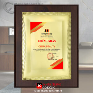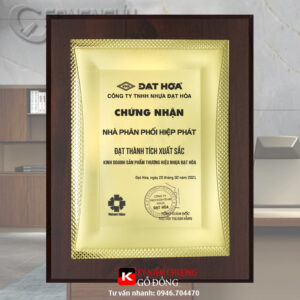 Bảng chứng nhận đại lý mạ vàng cao cấp được làm từ khung gỗ, kim loại. Nội dung đặt trên tấm kim loại. Thiết kế làm theo yêu cầu riêng của khách hàng. Bảng chứng nhận đại lý mạ vàng cao cấp với mẫu mã rất đa dạng, kích thước riêng theo yêu cầu của khách hàng.