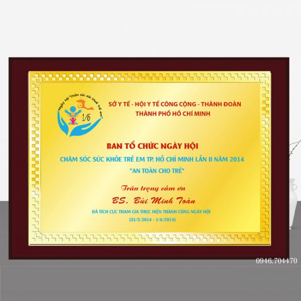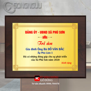 Bảng vàng tri ân 23cm x 30cm được làm từ khung gỗ, mặt nội dung bằng đồng, nội dung làm theo yêu cầu khách hàng. Bảng vàng tri ân, mẫu mã rất đa dạng, tặng được nhiều sự kiện.