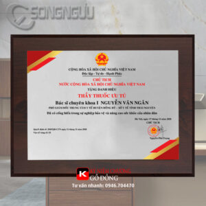 Bảng vinh danh Thầy thuốc ưu tú cao cấp được làm từ khung gỗ, kim loại. Nội dung đặt trên tấm kim loại. Thiết kế làm theo yêu cầu riêng của khách hàng. Bảng vinh danh Thầy thuốc ưu tú cao cấp với mẫu mã rất đa dạng, kích thước riêng theo yêu cầu của khách hàng.