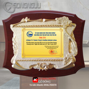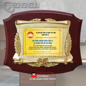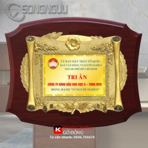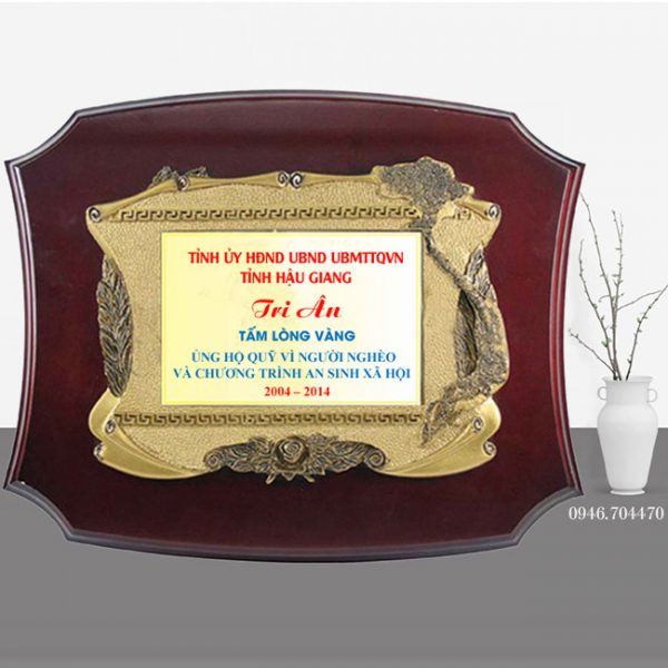 Biểu trưng tri ân tấm lòng vàng được làm từ khung gỗ, mặt nội dung bằng đồng, nội dung làm theo yêu cầu khách hàng. Biểu trưng tri ân tấm lòng vàng, mẫu mã rất đa dạng, tặng được nhiều sự kiện.