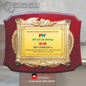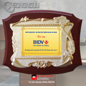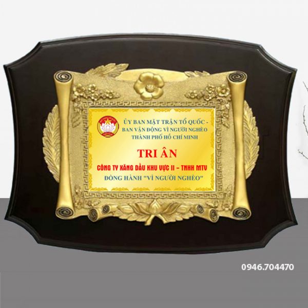 Biểu trưng tri ân đồng hành được làm từ khung gỗ, mặt nội dung bằng đồng, nội dung làm theo yêu cầu khách hàng. Biểu trưng tri ân đồng hành, mẫu mã rất đa dạng, tặng được nhiều sự kiện.