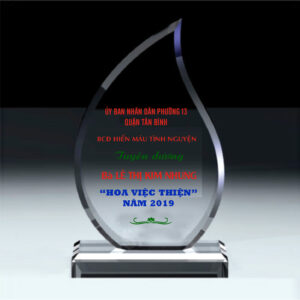 Kỷ niệm chương tuyên dương Hoa việc thiện được làm từ thủy tinh trong, phối thêm các màu khác theo yêu cầu, nội dung khắc hoặc in trực tiếp. Kỷ niệm chương tuyên dương Hoa việc thiện, mẫu mã rất đa dạng và nội dung theo yêu cầu riêng. Sản phẩm phù hợp dùng làm lưu niệm, khen thưởng trong các sự kiện.