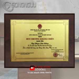 Mẫu huy chương kháng chiến cao cấp được làm từ khung gỗ, kim loại. Nội dung đặt trên tấm kim loại. Thiết kế làm theo yêu cầu riêng của khách hàng. Mẫu huy chương kháng chiến cao cấp với mẫu mã rất đa dạng, kích thước riêng theo yêu cầu của khách hàng.