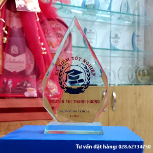 Kỷ niệm chương tốt nghiệp được làm từ thủy tinh hoặc pha lê. Sản phẩm phù hợp làm quà tặng lưu niệm, khen thưởng ngày ra trường, tốt nghiệp. Nội dung in khắc trực tiếp theo yêu cầu riêng từng sự kiện. Kỷ niệm chương tốt nghiệp đa dạng về mẫu mã, có nhiều kích thước khác nhau.